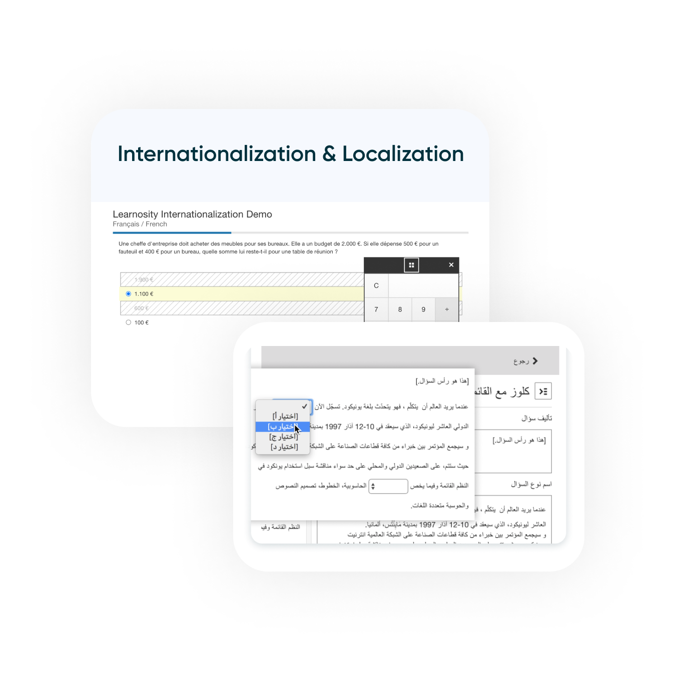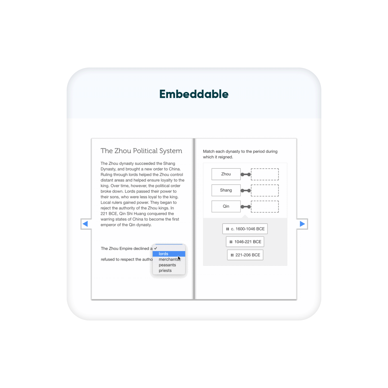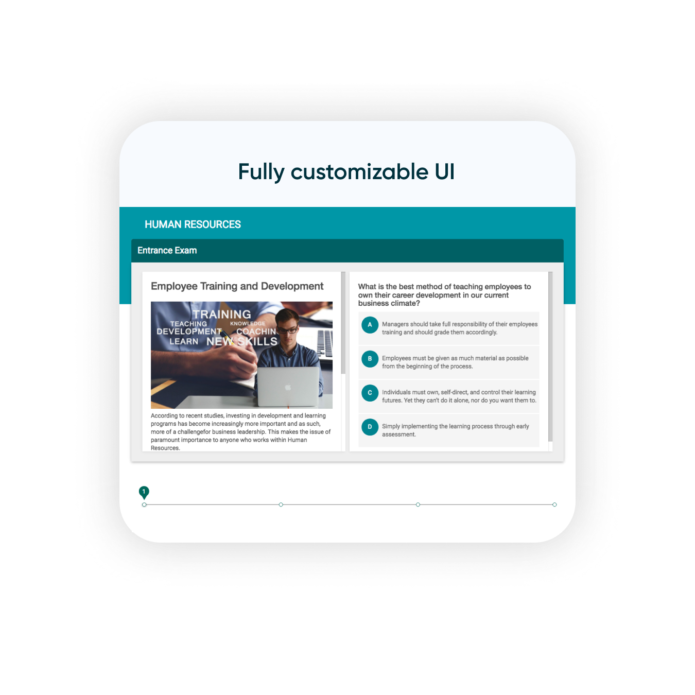 Seamlessly integrate single questions or whole tests into any learning environment and customize the look to perfectly match your product’s brand.