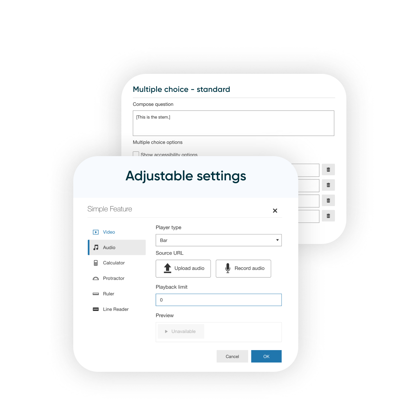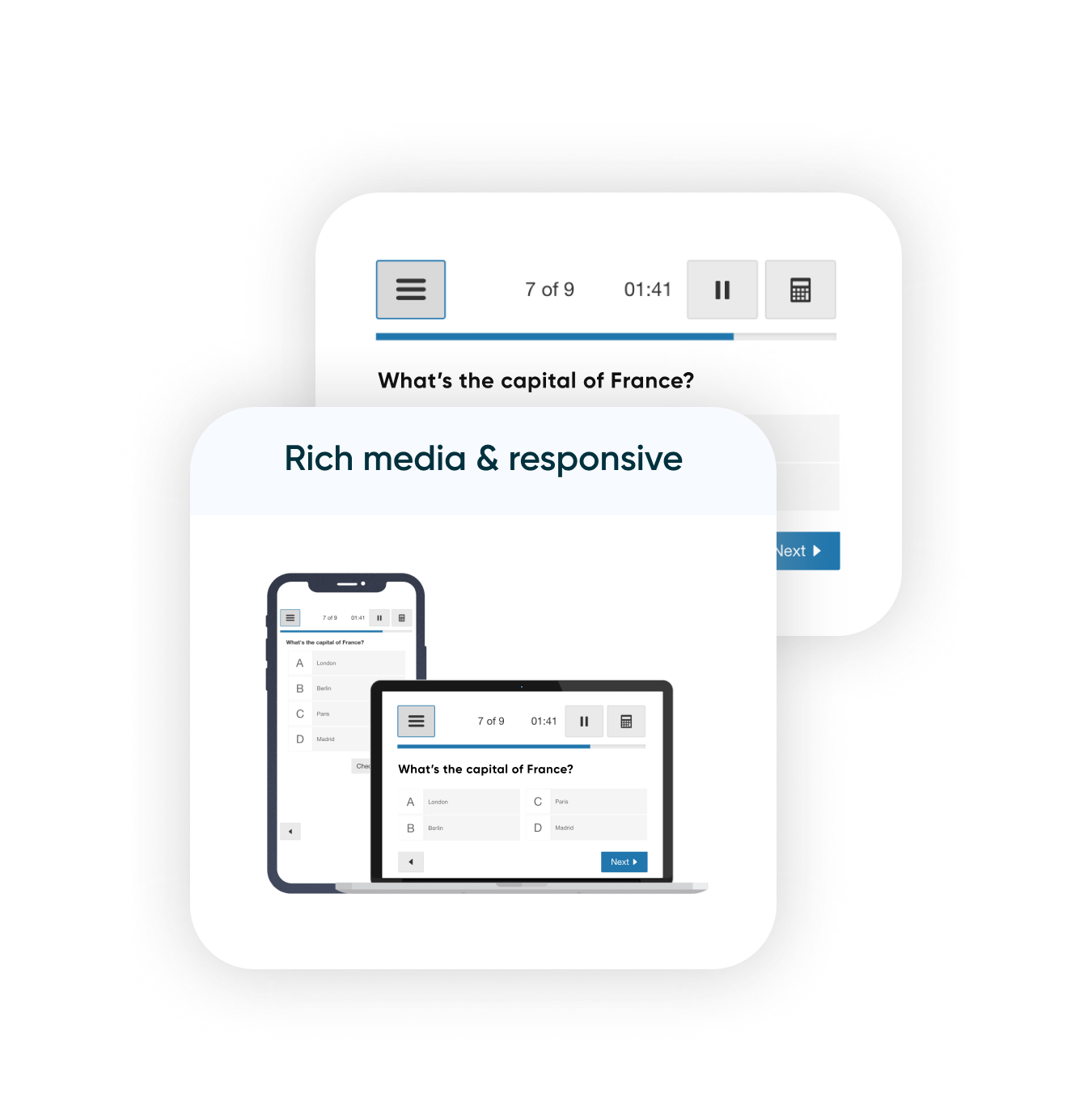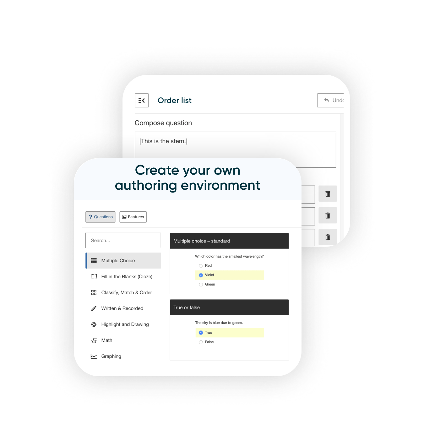 Create MCQs that are as simple or sophisticated as you like with support for flexible layouts, images, audio, distractor notes, math content, and more.