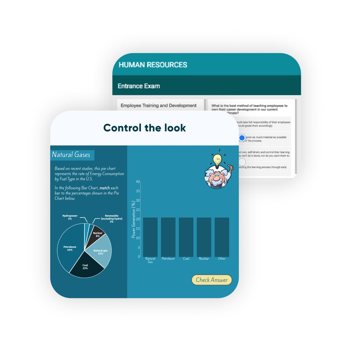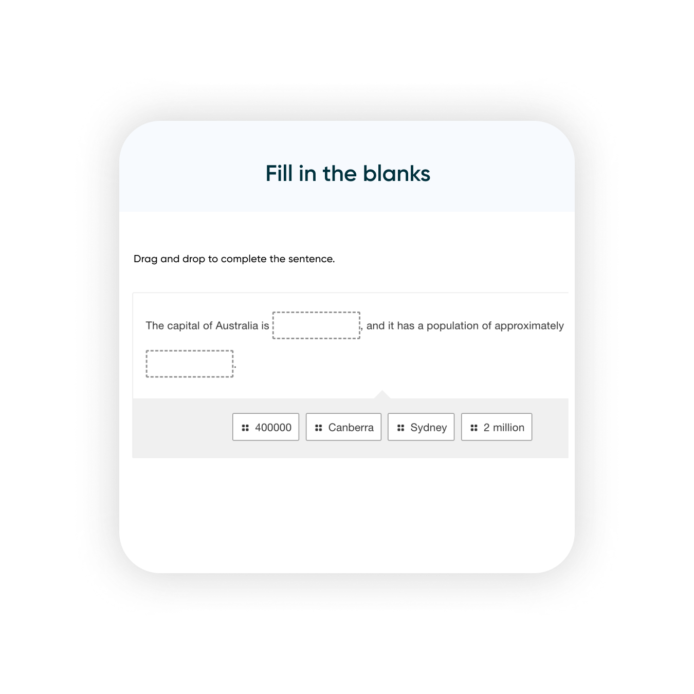 Easily create fill in the blanks questions using text, images, dropdowns, and drag and drop functionality.